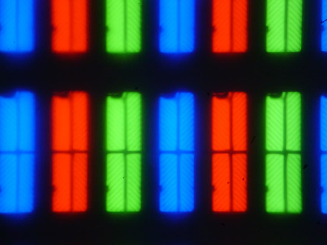 Видно, что субпиксели трех цветов (красного, зеленого и синего) поделены на четыре участка с доменами в различающейся ориентации. Отметим, что никакого видимого «кристаллического» эффекта (микроскопической вариации яркости и оттенка) в данном случае нет.