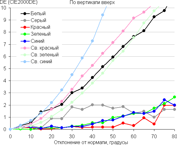Для количественной характеристики изменения цветопередачи мы провели колориметрические измерения для белого, серого (127, 127, 127), красного, зеленого и синего, а также светло-красного, светло-зеленого и светло-синего полей во весь экран с использованием установки, подобной той, что применялась в предыдущем тесте. Измерения проводились в диапазоне углов от 0° (датчик направлен перпендикулярно к экрану) до 80° с шагом в 5°. Полученные значения интенсивностей были пересчитаны в отклонение ΔE относительно замера каждого поля при перпендикулярном положении датчика относительно экрана. Результаты представлены ниже: