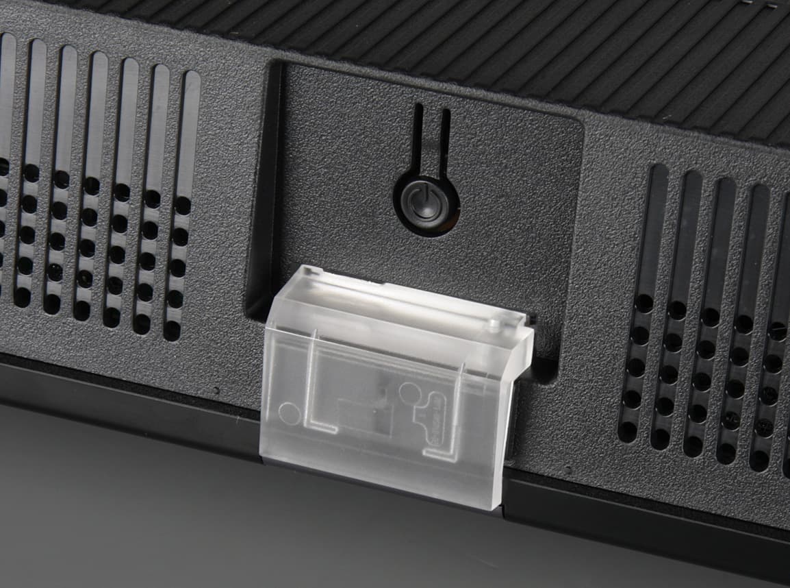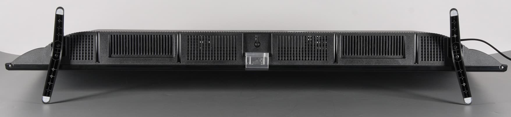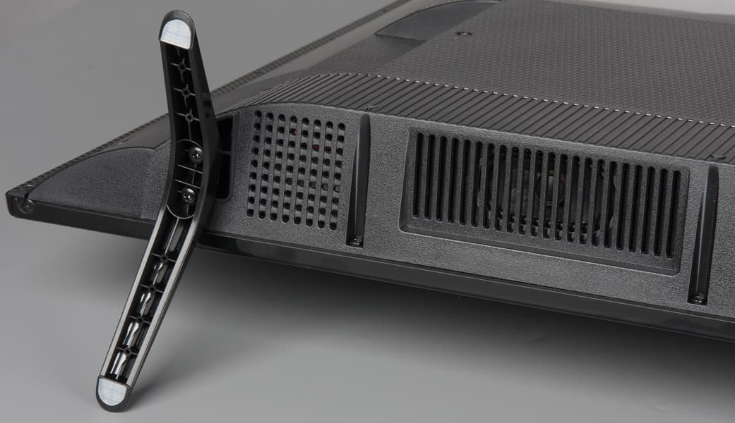 Альтернативный способ установки телевизора без использования штатных ножек — крепление телевизора на стену с помощью кронштейна под монтажные отверстия VESA 100 на 100 мм. Разъемы размещены в нише на задней панели и ориентированы вбок. Кабель питания неотсоединяемый. На нижнем торце и сверху на выступе сзади есть вентиляционные решетки.