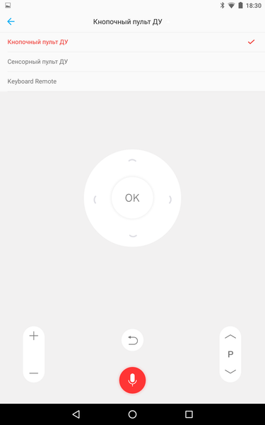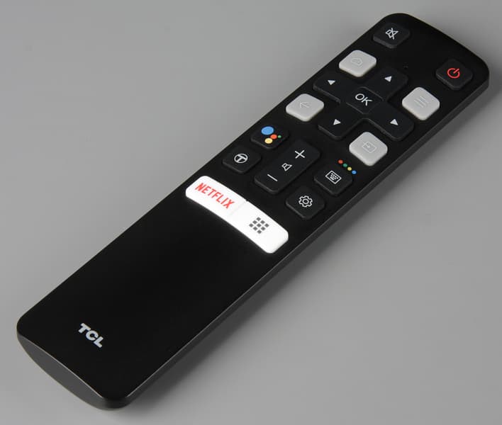 Настоящий пульт гибридный: он работает по ИК-каналу и по Bluetooth. К особенностям дизайна пульта относится отсутствие окошка спереди: ИК-диод светит прямо через переднюю стенку корпуса. Сопряжение пульта с ТВ, необходимое для работы по Bluetooth, происходит при первом запуске голосового помощника от Google, то есть при первом нажатии на кнопку с разноцветными кружками. Сопряженный пульт передает все команды, за исключением команды включения/выключения по Bluetooth, что значительно повышает удобство управления. Голосовой помощник поможет найти контент (который предоставляют ряд программ) и запустить некоторые из установленных программ.