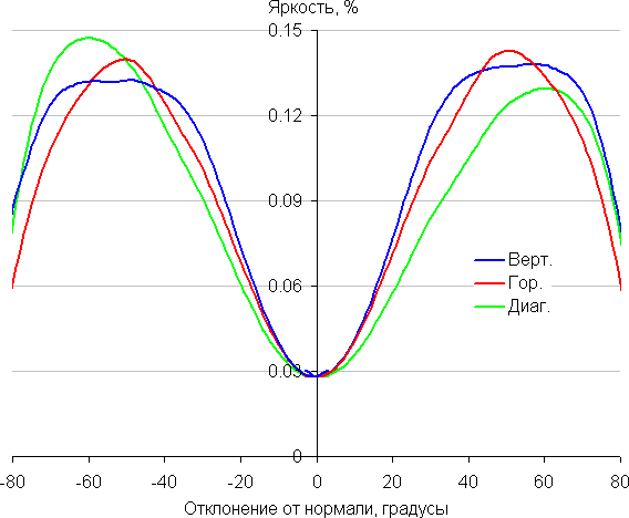 Чтобы выяснить, как меняется яркость экрана при отклонении от перпендикуляра к экрану, мы провели серию измерений яркости белого в центре экрана в широком диапазоне углов, отклоняя ось датчика в вертикальном, горизонтальном и диагональном (из угла в угол) направлениях.