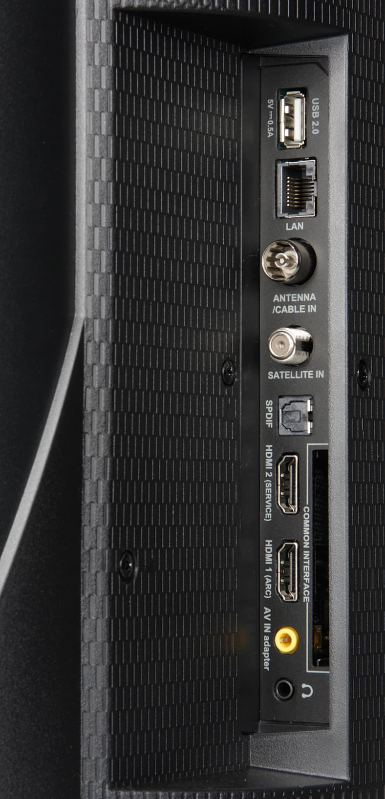 Большинство разъемов стандартные, полноразмерные и размещены более-менее свободно. Исключение — разъем для ввода композитного видеосигнала и стереозвука в аналоговом виде, который представляет собой гнездо для четырехконтактного миниджека. Впрочем, производитель не забыл приложить к телевизору соответствующий переходник на три RCA.
