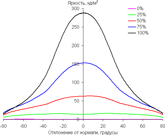 В качестве реперной точки можно выбрать отклонение в 45°. Критерием сохранения правильности цветов можно считать значение ΔE меньше 3. Из графиков следует, что при взгляде под углом первичные цвета меняется несильно, но полутона существенно изменяются, что ожидаемо для матрицы типа VA* и является ее основным недостатком.