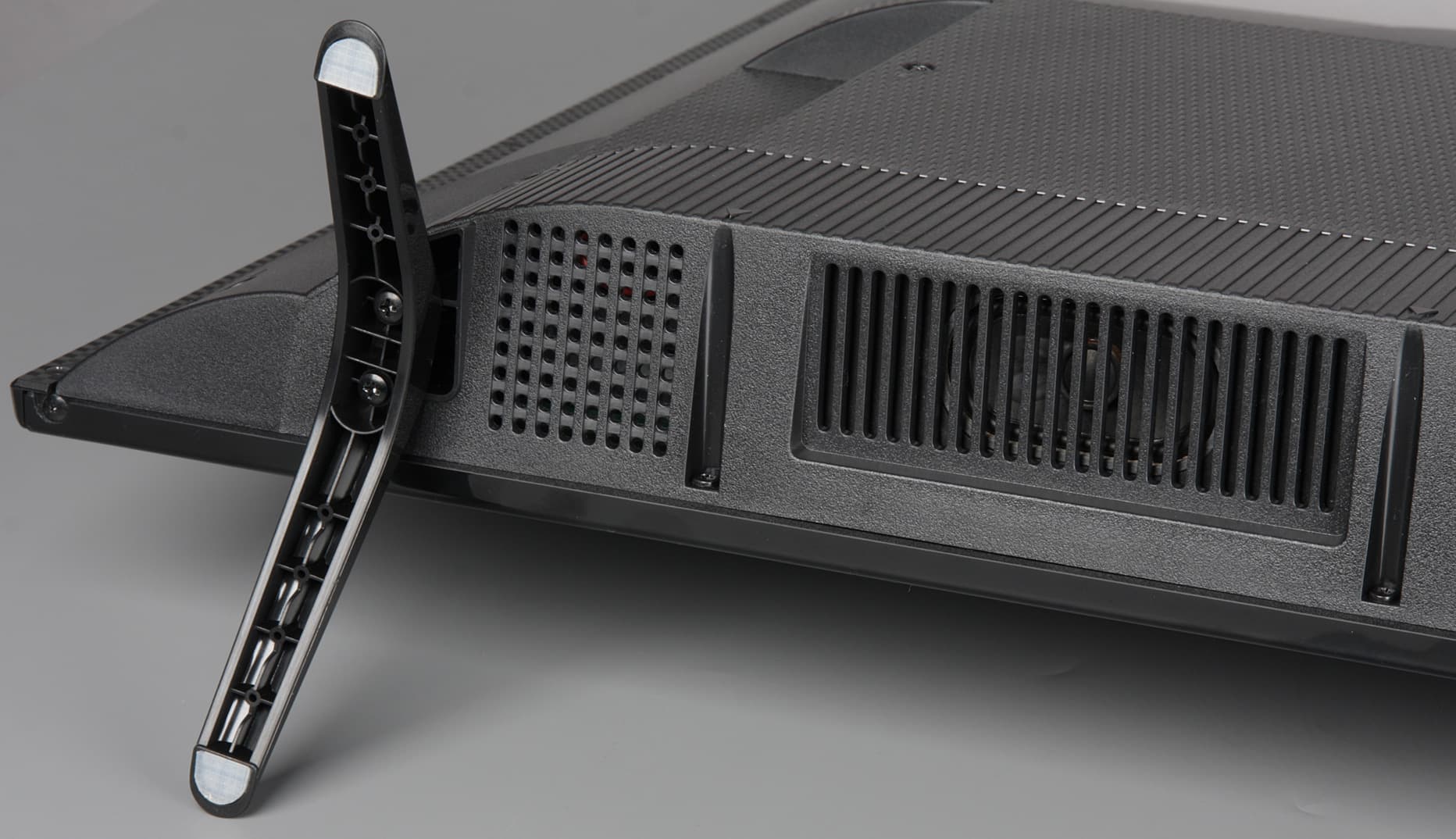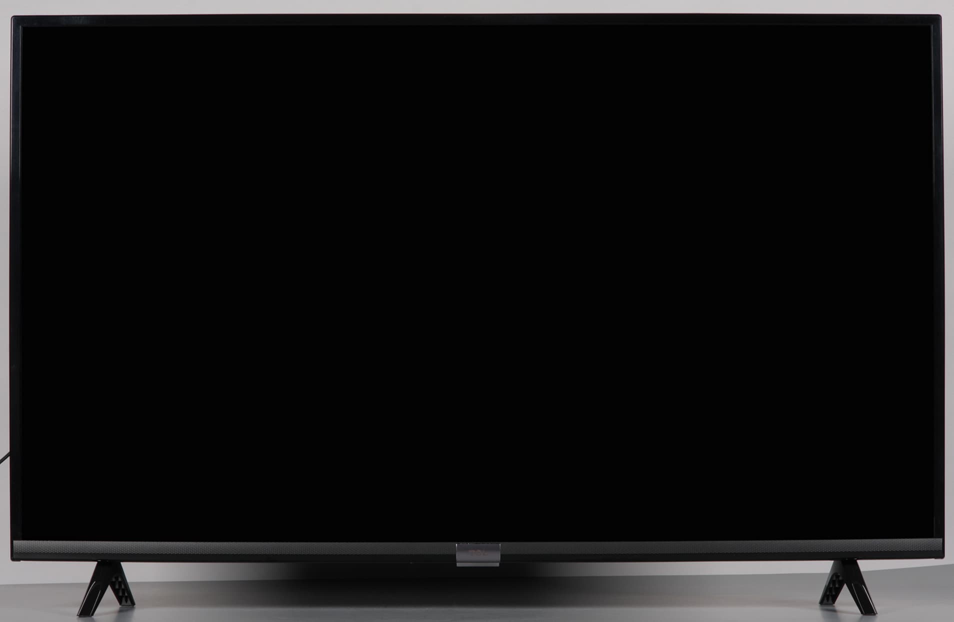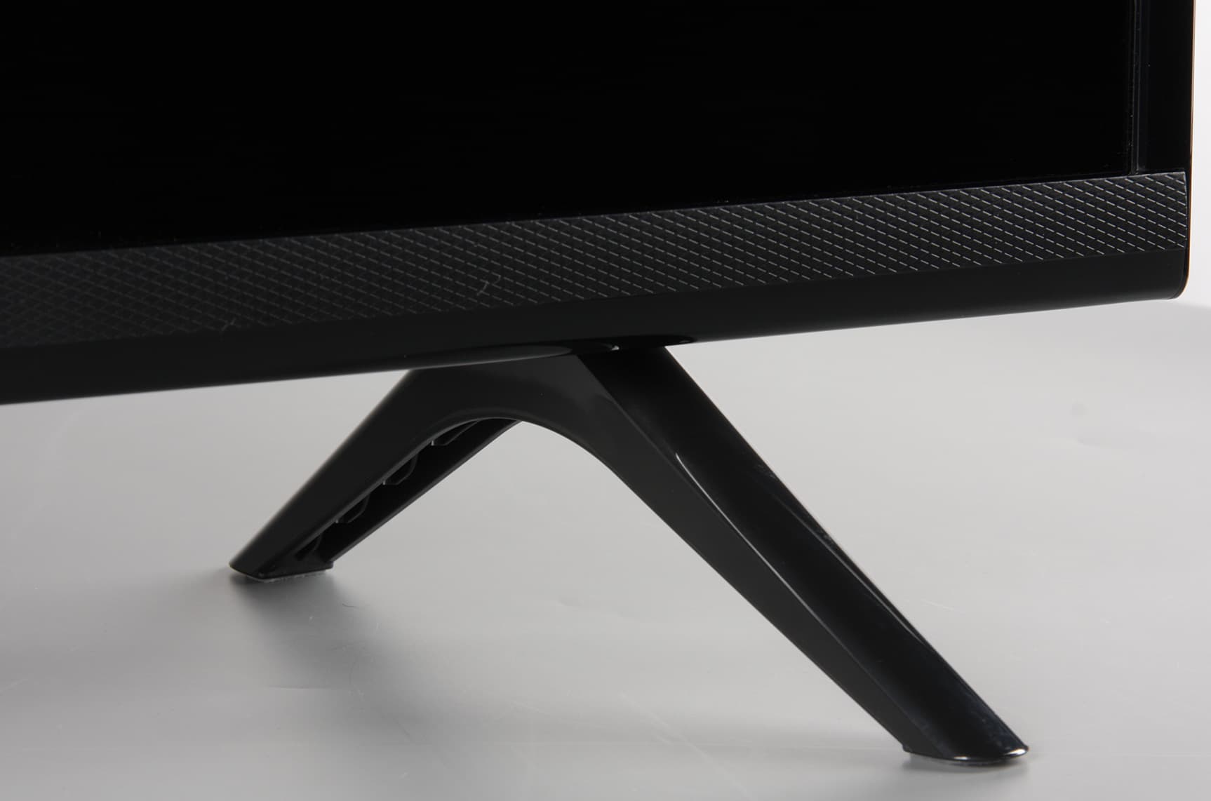 По выбору пользователя в режиме ожидания индикатор состояния может ровно светиться, мигать, с плавным нарастанием и спадом яркости, или оставаться выключенным. При работе телевизора индикатор не горит. Штатная подставка состоит из двух ножек галочкой, исполненных из пластика. Снаружи поверхность ножек зеркально-гладкая. Опираются ножки на противоскользящие накладки из полупрозрачного упругого пластика.