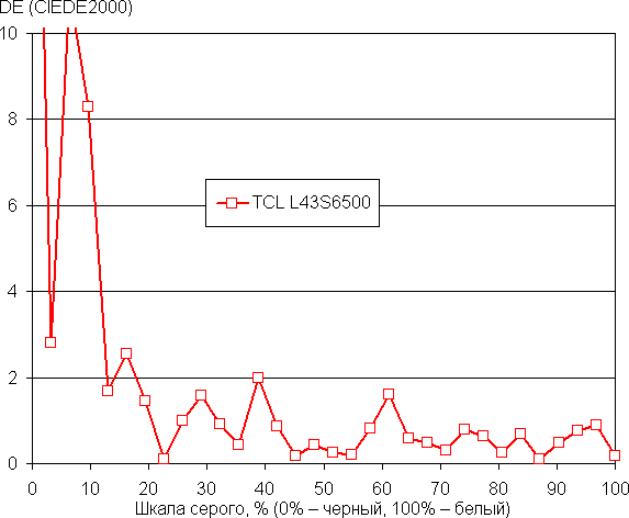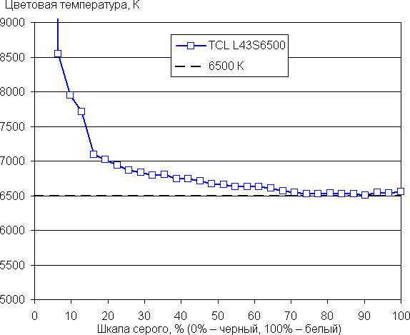 Самый близкий к черному диапазон можно не учитывать, так как в нем цветопередача не так важна, а погрешность измерения цветовых характеристик высокая. Видно, что несложная настройка позволила достигнуть хорошего результата — цветовая температура стала существенно ближе к стандартным 6500 К, а ΔE меньше 2 на большей части шкалы серого (а это очень хорошо), при этом оба параметра мало изменяются от оттенка к оттенку на значимой части шкалы серого — это положительно сказывается на визуальной оценке цветового баланса.