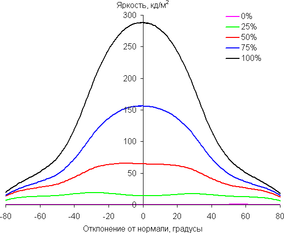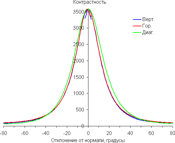 Отметим относительно плавное уменьшение яркости при отклонении от перпендикуляра к экрану во всех трех направлениях, при этом графики яркости полутонов не пересекаются во всем диапазоне измеряемых углов. Яркость черного поля при отклонении от перпендикуляра к экрану возрастает, но всего до примерно 0,15% от максимальной яркости белого поля. Это очень хороший результат. Контрастность в диапазоне углов ±82° для всех направлений значительно превышает 10:1.