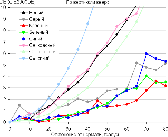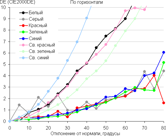 Для количественной характеристики изменения цветопередачи мы провели колориметрические измерения для белого, серого (127, 127, 127), красного, зеленого и синего, а также светло-красного, светло-зеленого и светло-синего полей во весь экран с использованием установки, подобной той, что применялась в предыдущем тесте. Измерения проводились в диапазоне углов от 0° (датчик направлен перпендикулярно к экрану) до 80° с шагом в 5°. Полученные значения интенсивностей были пересчитаны в отклонение ΔE относительно замера каждого поля при перпендикулярном положении датчика относительно экрана. Результаты представлены ниже: