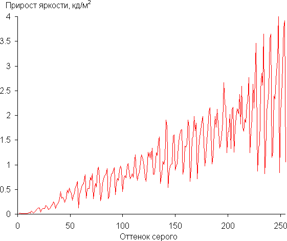 Предварительные тесты показали, что гамма-кривая ближе всего к стандартной при настройке Гамма равной 0. Поэтому далее для оценки характера роста яркости мы измерили яркость 256 оттенков серого (от 0, 0, 0 до 255, 255, 255) именно при этом значении. График ниже показывает прирост (не абсолютное значение!) яркости между соседними полутонами: