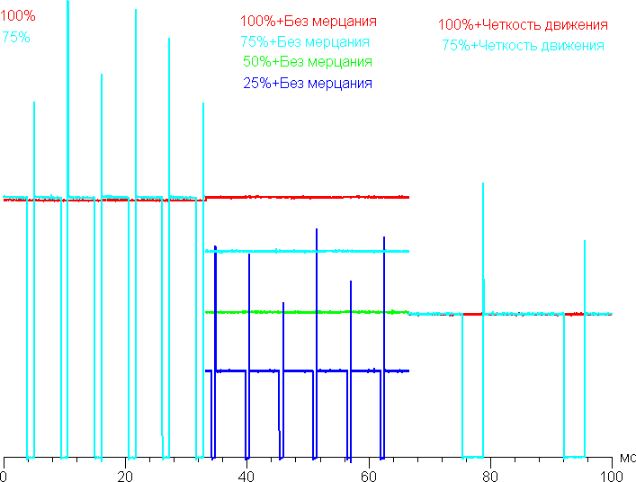 Есть функция, повышающая четкость объектов в движении. Достигается это за счет все той же модуляции с частотой 60 Гц, но появляется она только при снижении яркости. Мерцание в этом случае уже отчетливо видно, и оно очень утомляет, поэтому практической пользы этот режим не имеет. На графике ниже мы попытались наглядно представить все три режима на нескольких уровнях яркости (по горизонтально оси — время, по вертикальной — яркость, для наглядности графики совмещены):