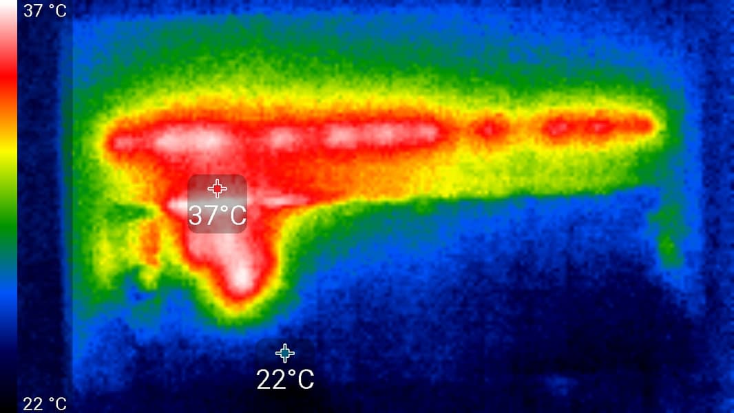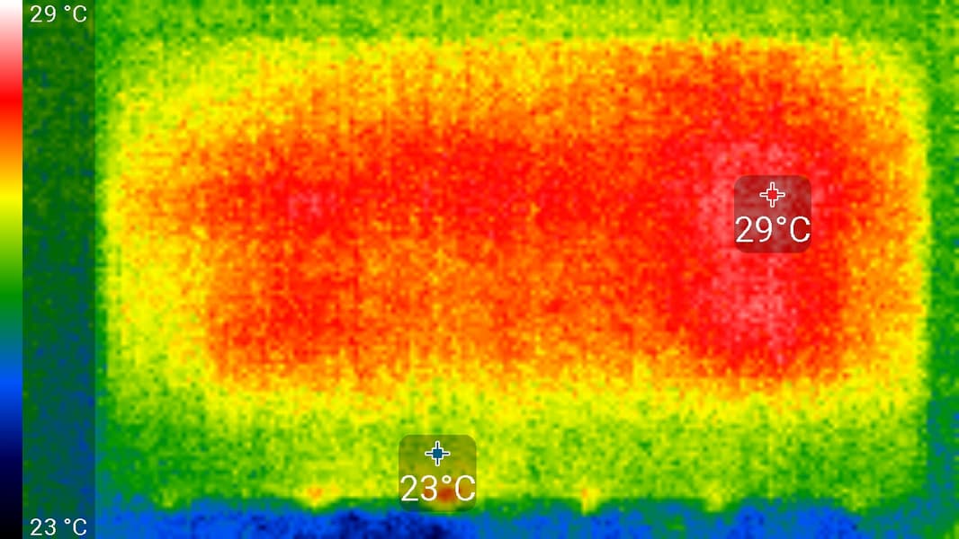Видно, что основным источником тепла является центральная область экрана и 6 точек внизу под рамкой. По всей видимости, в данном телевизоре используется не краевая, а задняя подсветка, не поделенная на независимо управляемые зоны.