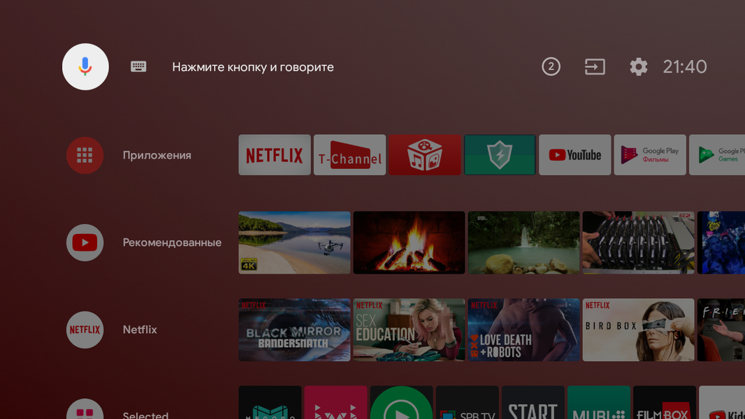 Домашняя страница в Android TV представляет собой несколько горизонтальных лент с плитками установленных приложений и рекомендуемого контента. В верхней части страницы есть значки-кнопки голосового и текстового ввода строки поиска, для вывода системных сообщения, выбора входов и для доступа к настройкам и часы.