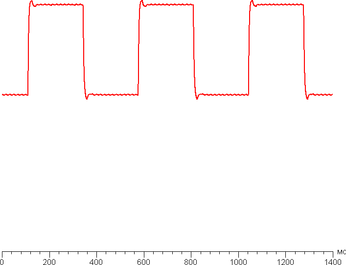 Время отклика при переходе черный-белый-черный равно 14,4 мс (8,4 мс вкл. + 6,0 мс выкл.). Переходы между полутонами происходят в среднем за 13,4 мс в сумме. Есть очень незначительный «разгон» матрицы, не приводящий к видимым артефактам. Ниже приведены графики полутонового перехода между оттенками 60% и 80% и обратно (по вертикали — яркость, по горизонтали — время):