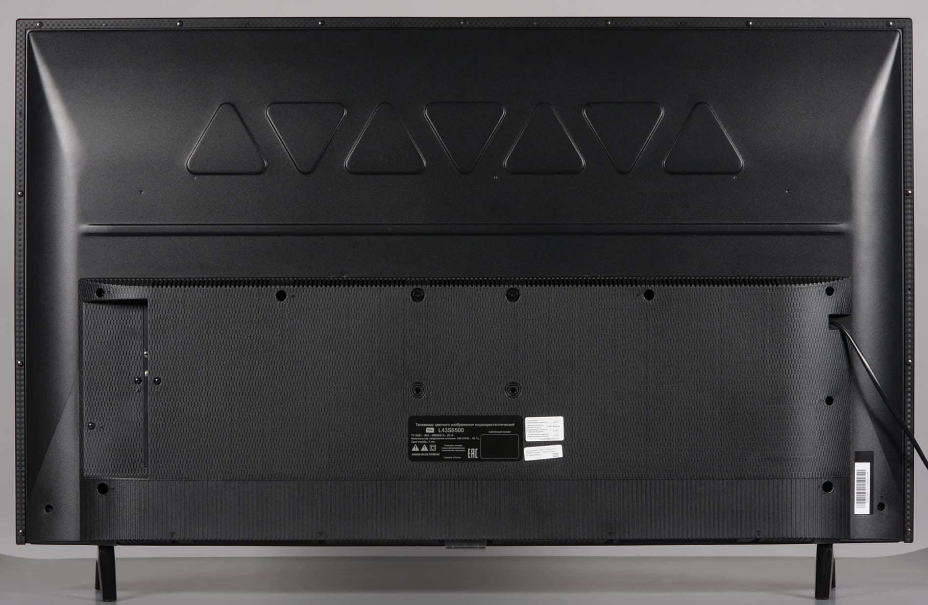 Выступающая назад пластиковая часть задней панели декорирована рельефным узором. Телевизор по современным меркам не очень тонкий. Внешняя поверхность ЖК-матрицы черная и почти зеркально-гладкая, но слабое матирование присутствует, поэтому отражения в экране чуть-чуть размыты. Антибликовые свойства экрана выражены не так сильно, как в ряде моделей, чьи экраны имеют специальное покрытие. Спереди по центру планки снизу находится металлическая вставка с логотипом производителя.