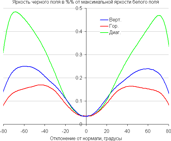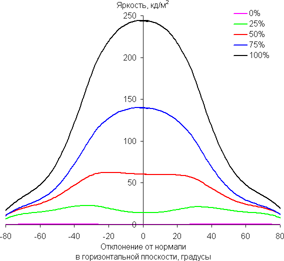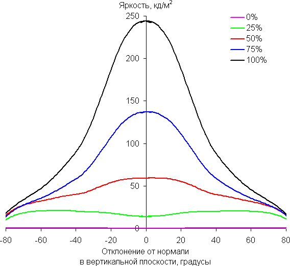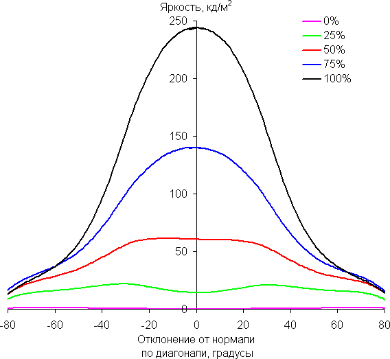 По скорости снижения яркости углы обзора неширокие. При этом в значимом диапазоне измеряемых углов графики яркости полутонов не пересекаются (то есть нет инвертирования яркости оттенков). Яркость черного поля при отклонении от перпендикуляра к экрану возрастает, но всего до примерно 0,5% от максимальной яркости белого поля и только при большом отклонении. Это хороший результат. Контрастность в диапазоне углов ±82° для двух направлений значительно превышает 10:1. Для диагонального направления контрастность при отклонении снижается быстрее, но все равно не опускается за эту отметку.