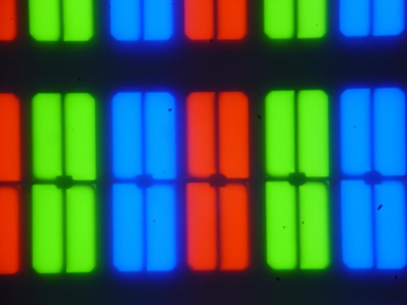 Выявленные характеристики экрана подтверждают, что в данном телевизоре установлена матрица типа *VA. Микрофотографии не противоречат этому, хотя тонкую структуру в виде параллельных полосок в данном случае выявить не удалось (черные точки — это пыль на матрице фотоаппарата):