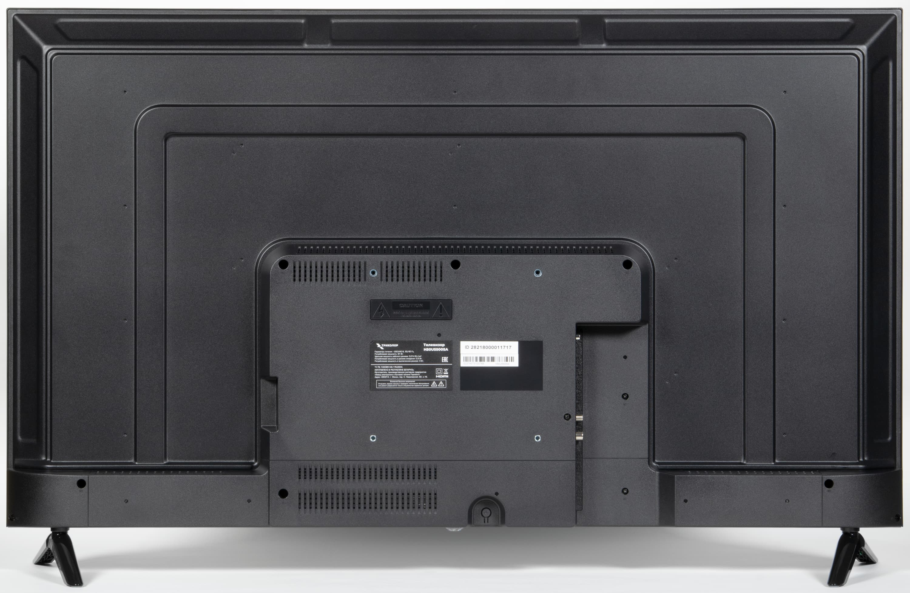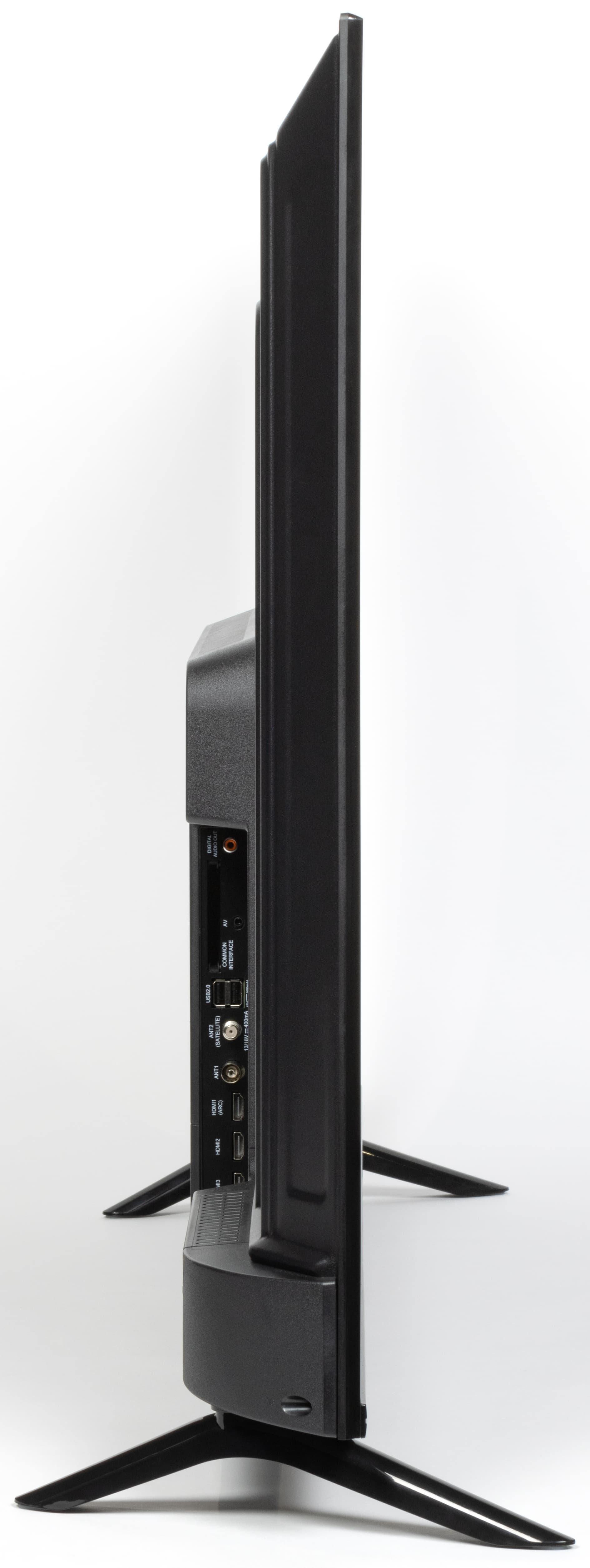 Задняя панель условно в верхней части изготовлена из тонкого листа стали и имеет стойкое черное матовое покрытие. Выступающий назад кожух в нижней части с заходом на нижний торец изготовлен из черного пластика с матовой поверхностью. Интерфейсные разъемы размещены в незамкнутой нише и направлены вбок. Подключать кабели к разъемам неудобно, так как приходится далеко тянуться. Разъем питания расположен в нише с противоположной стороны выступа сзади. Даже в верхней части телевизор не тонкий.
