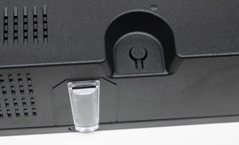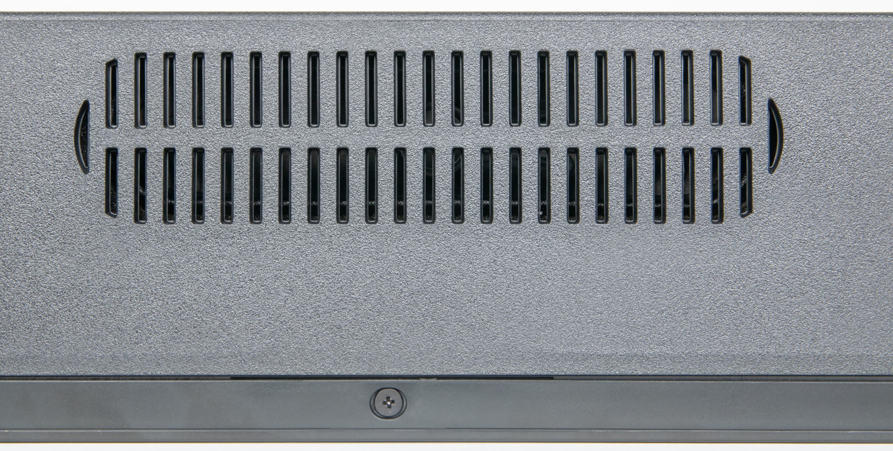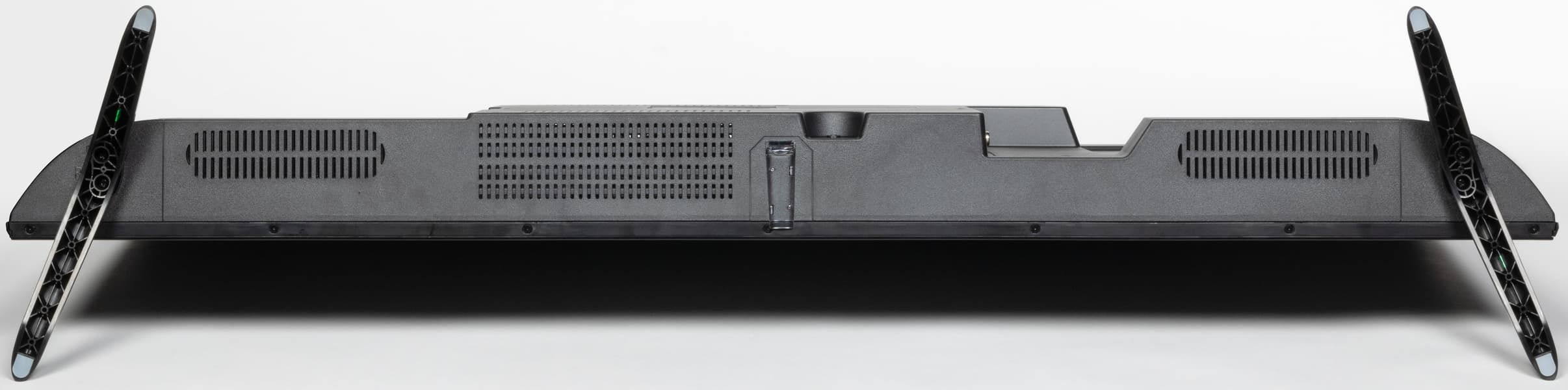 На пластиковом кожухе сзади, на верхних торцах и снизу есть вентиляционные решетки. За решетками на нижнем торце можно разглядеть пару громкоговорителей с вытянутыми диффузорами.