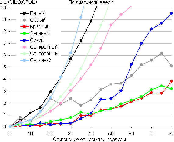 В качестве реперной точки можно выбрать отклонение в 45°. Критерием сохранения правильности цветов можно считать значение ΔE меньше 3. Из графиков следует, что при взгляде под углом хотя бы основные цвета меняются несильно, но полутона существенно изменяются, что ожидаемо для матрицы типа VA* и является ее основным недостатком.