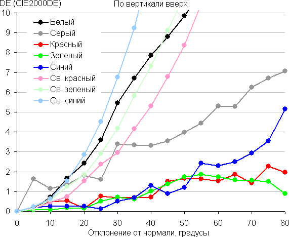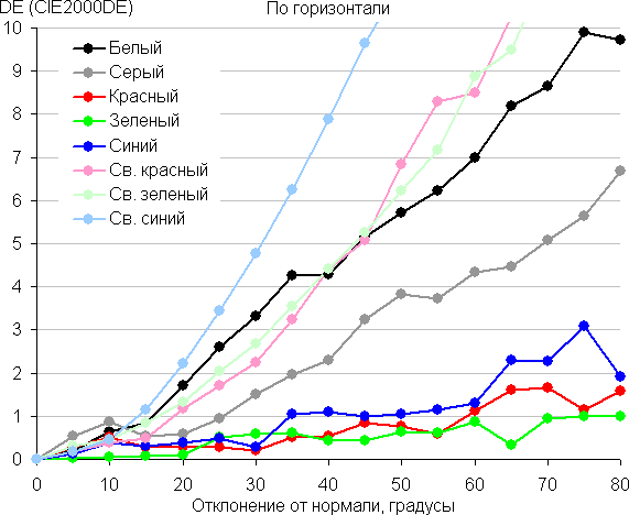 Для количественной характеристики изменения цветопередачи мы провели колориметрические измерения для белого, серого (127, 127, 127), красного, зеленого и синего, а также светло-красного, светло-зеленого и светло-синего полей во весь экран с использованием установки, подобной той, что применялась в предыдущем тесте. Измерения проводились в диапазоне углов от 0° (датчик направлен перпендикулярно к экрану) до 80° с шагом в 5°. Полученные значения интенсивностей были пересчитаны в отклонение ΔE относительно замера каждого поля при перпендикулярном положении датчика относительно экрана. Результаты представлены ниже: