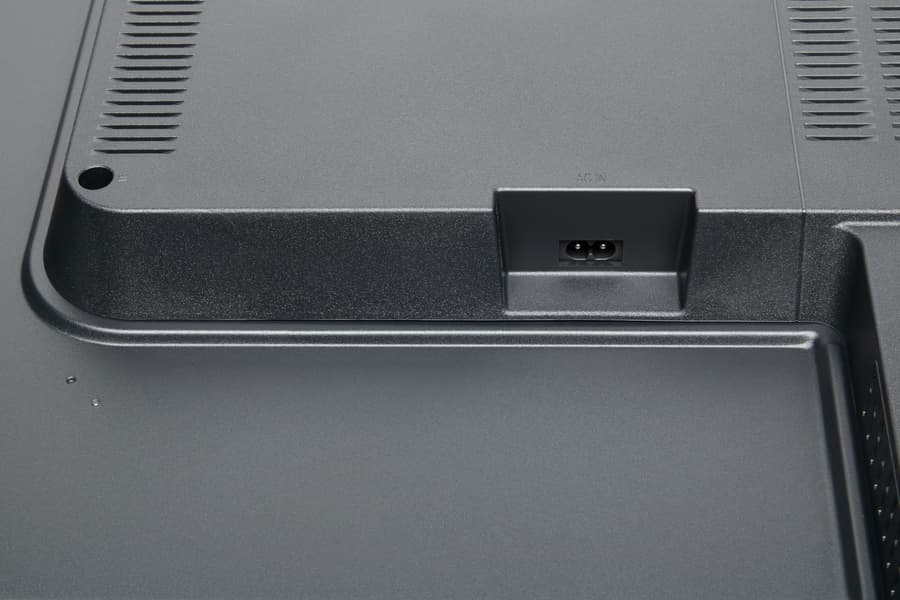 Дизайн строгий, декоративные элементы отсутствуют. Экран визуально безрамочный, он выглядит как монолитная поверхность, ограниченная снизу узкой планкой, а сверху и с боков — узкой окантовкой. Выведя изображение на экран, можно увидеть, что на самом деле между внешними границами экрана и собственно областью отображения есть неширокие поля (от области отображения до внешних границ экрана сверху и с боков примерно по 10 мм, а снизу — 19 мм). Внешняя поверхность матрицы выглядит глянцевой, но при перпендикулярном взгляде видно легкое матовое размытие отраженных объектов, что обусловлено наклеенной на экран пленкой со слегка матовой поверхностью. Специального антибликового покрытия нет. Поверхность экрана с виду черная и на ощупь жесткая.