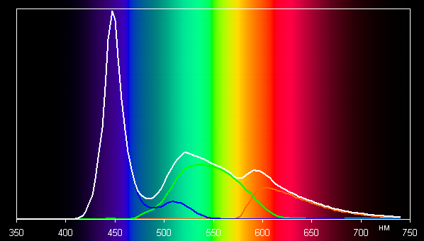 Такой спектр с относительно узким пиком синего и с широкими горбами зеленого и красного цветов характерен для ЖК-матриц, в которых используется белая светодиодная подсветка с синим излучателем и желтым люминофором.