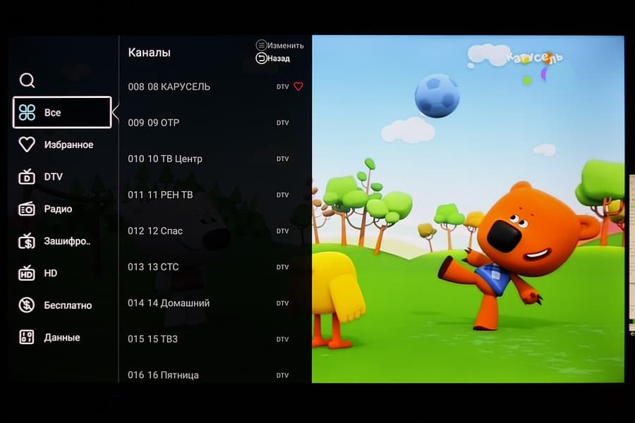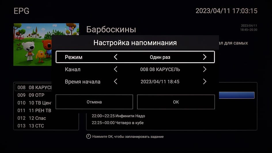 Есть поддержка электронной программы передач — можно посмотреть, что именно идет или будет идти на текущем и других каналах, а также настроить напоминание о просмотре.