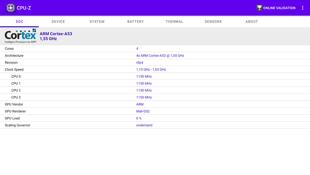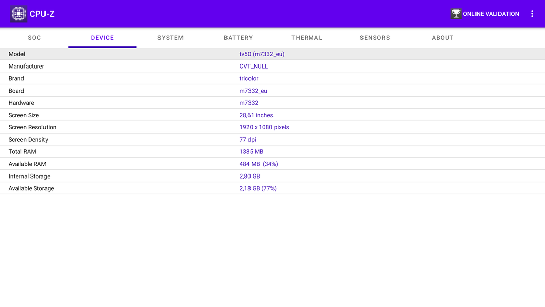 Программной платформой для этого ТВ служит операционная система Android версии 11. Конфигурацию аппаратной части поясняют данные программы CPU-Z: