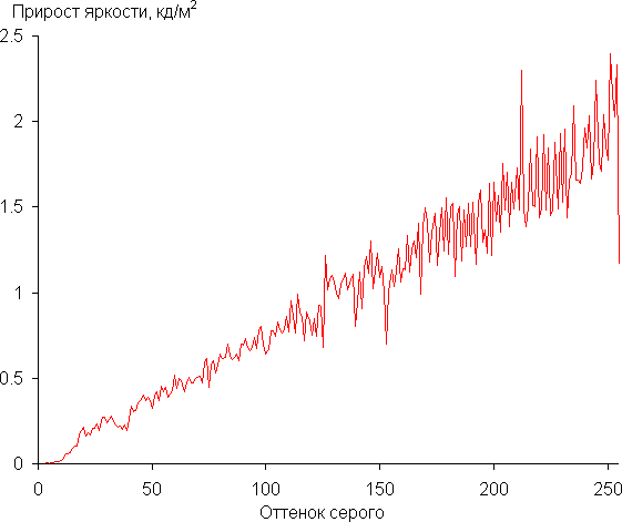 Для оценки характера роста яркости на шкале серого мы измерили яркость 256 оттенков серого (от 0, 0, 0 до 255, 255, 255), снизив значение настройки Контраст до 49, чтобы в светах не было завала на один оттенок. График ниже показывает прирост (не абсолютное значение!) яркости между соседними полутонами: