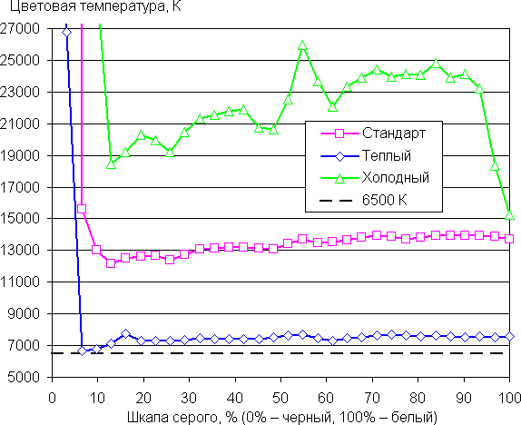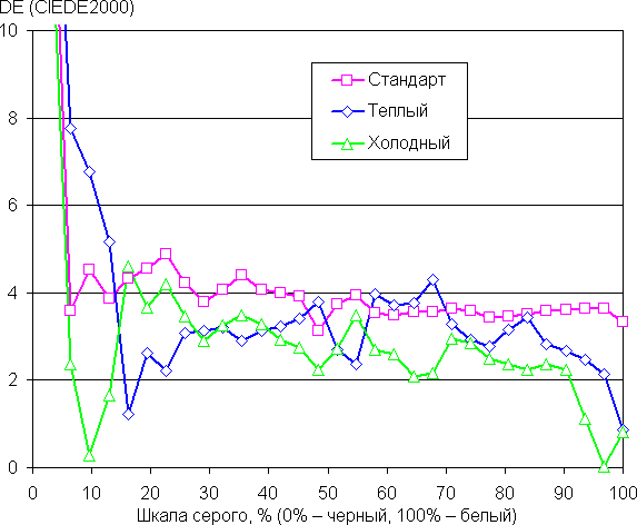 Самый близкий к черному диапазон можно не учитывать, так как в нем цветопередача не так важна, а погрешность измерения цветовых характеристик высокая. ΔE достаточно низкая во всех трех случаях. В случае вариантов Стандарт и Теплый оба параметра мало изменяется от оттенка к оттенку на значимой части шкалы серого — это положительно сказывается на визуальной оценке цветового баланса. Можно выбрать профиль Теплый, тогда цветовая температура станет ближе к стандартным 6500 К. Профиль Холодный отличается плохим цветовым балансом, поэтому выбирать его смысла нет.