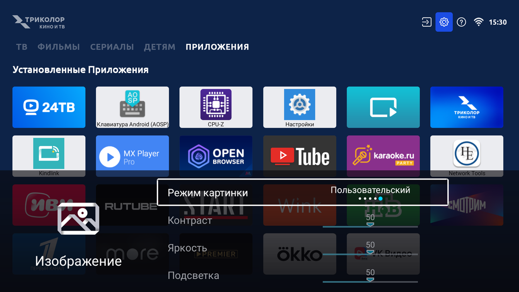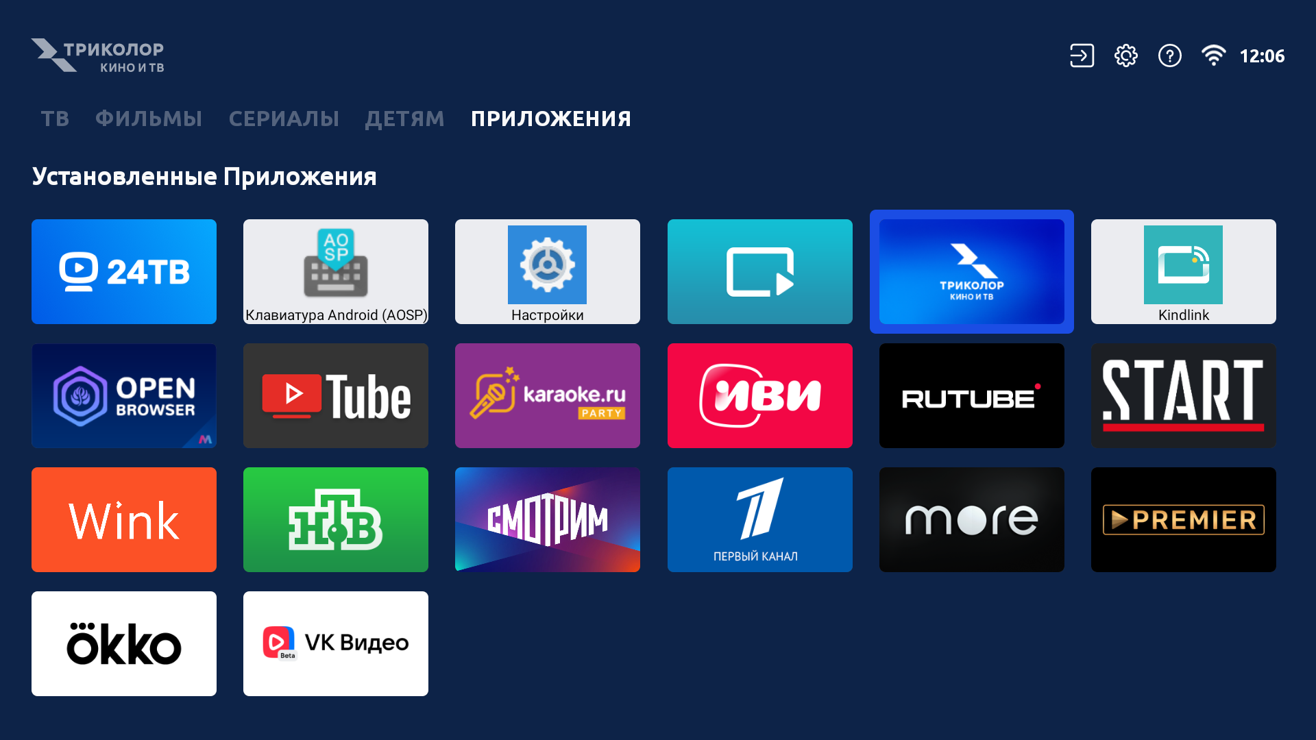 Предустановленных приложений немного — интернет-браузер, файловый менеджер, используемый в том числе для запуска мультимедийных фалов на воспроизведение, разумеется, приложение «Триколор Кино и ТВ» и еще несколько сервисов потокового вещания: