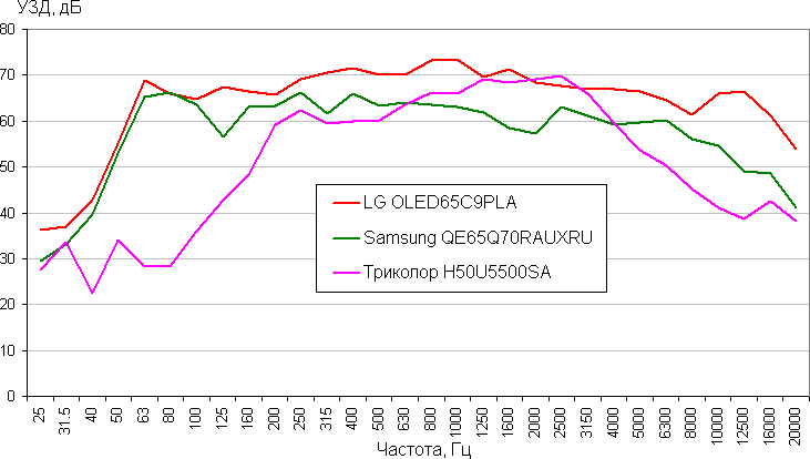 Громкость встроенной акустической системы для жилой комнаты, соответствующей по размерам данной диагонали экрана, вполне достаточная. Стереофонический эффект есть. Присутствуют высокие и средние частоты, низких — практически нет. Явно есть паразитные резонансы корпуса. В целом даже для класса встроенной в телевизор акустики ее качество среднее. Сравним АЧХ этого ТВ с АЧХ двух телевизоров высшего класса (получена с помощью шумомера при воспроизведении звукового файла с розовым шумом, интервал УЗД в 1/3 октавах):