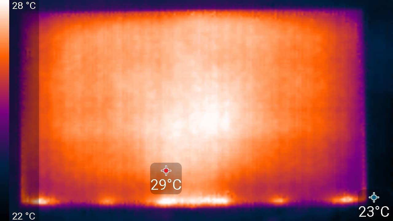 Нагрев телевизора можно оценить по приведенному снимку с ИК-камеры, полученному после долговременной работы на максимальной яркости в помещении с температурой примерно 24 °C: