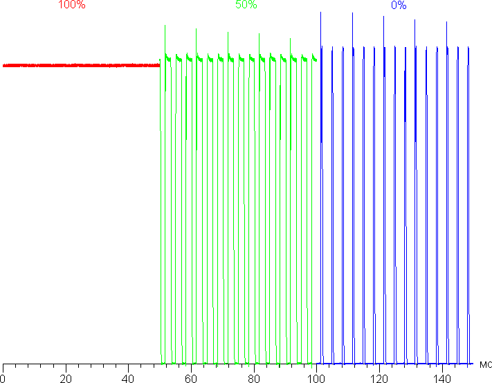 Управление яркостью свечения подсветки осуществляется с помощью ШИМ с частотой 300 Гц. Ниже приведена зависимость яркости от времени, числа — это значения настройки Подсветка: