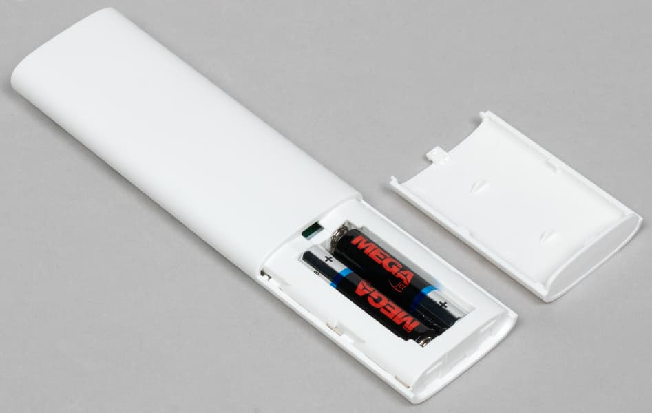 Пульт небольшой и легкий (159×40×14 мм, а с элементами питания он весит 71 г). Корпус пульта изготовлен из белого пластика с матовой поверхностью. В переднем торце есть вставка из тонированного пластика.