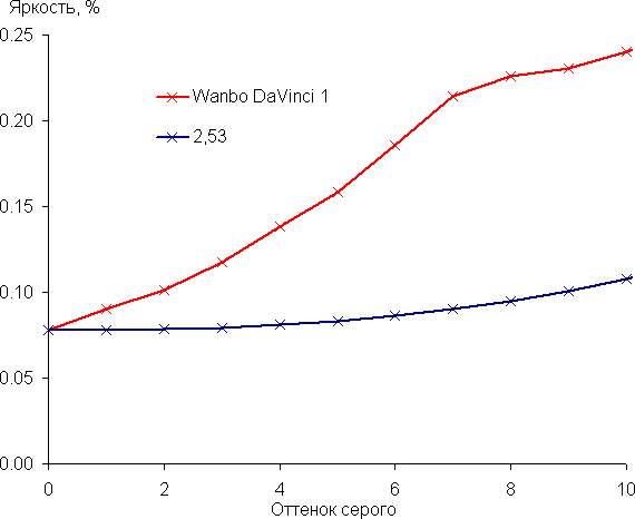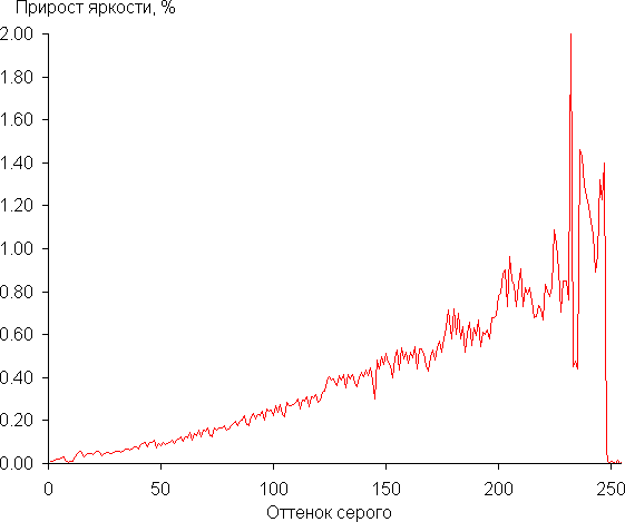 Для оценки характера роста яркости на шкале серого мы измерили яркость 256 оттенков серого (от 0, 0, 0 до 255, 255, 255). График ниже показывает прирост (не абсолютное значение!) яркости между соседними полутонами: