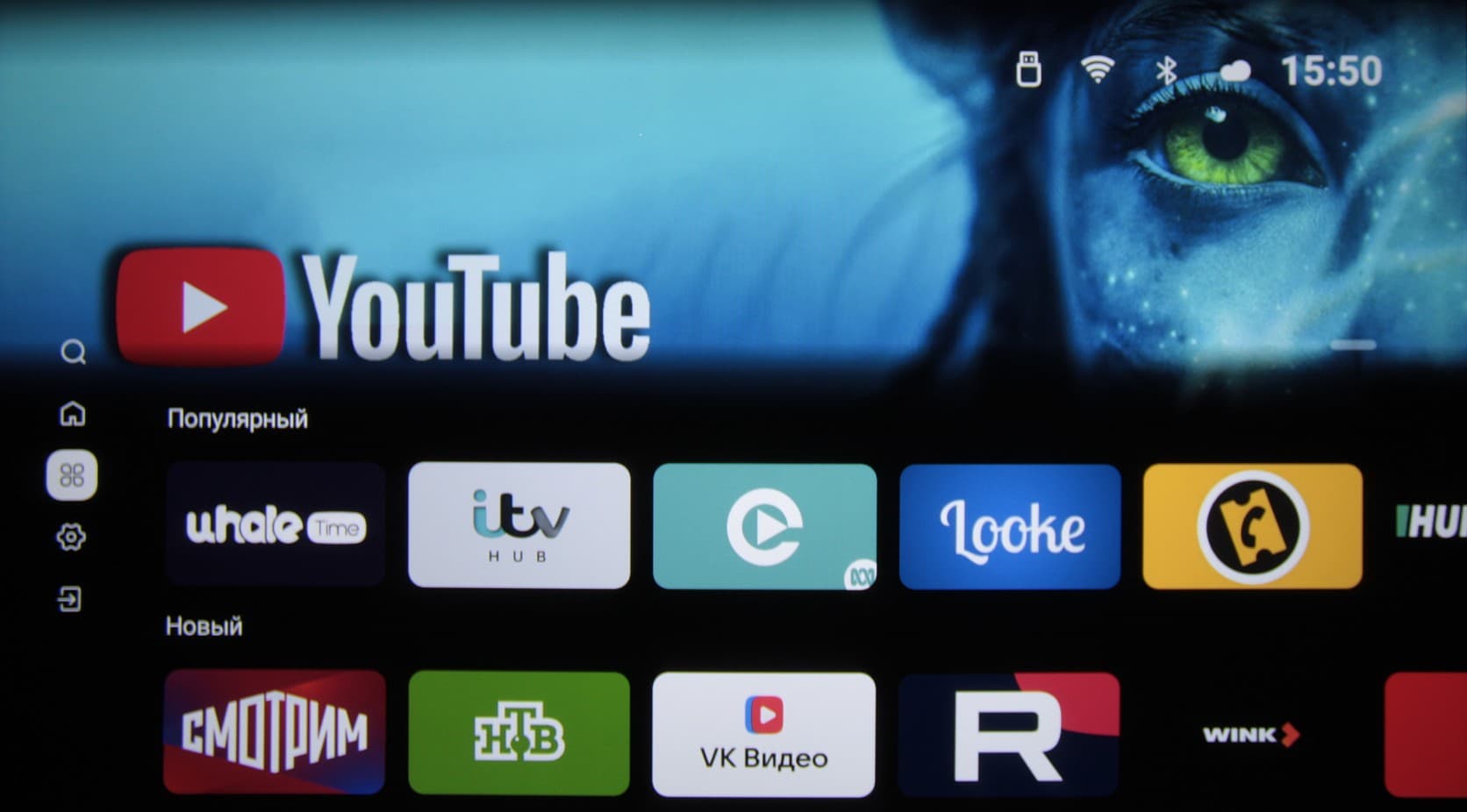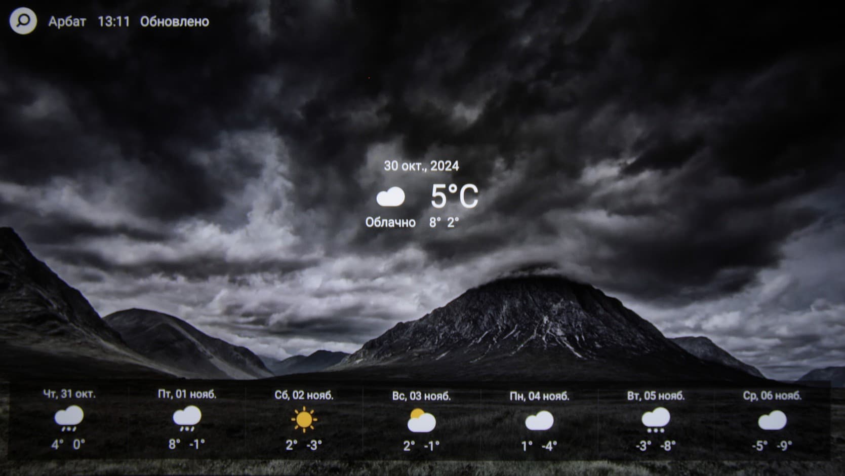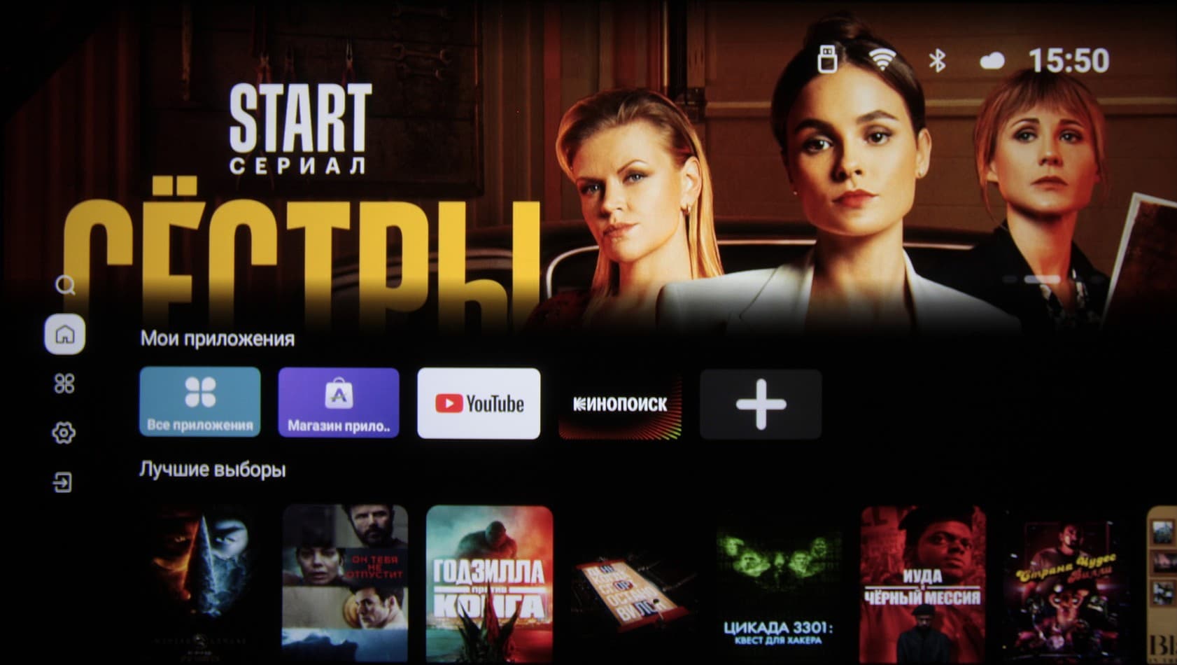 Интерфейс переведен на русский язык, качество перевода ужасным не назовешь. Отметим, что в целом ни к стабильности работы, ни к отзывчивости оболочки у нас особых претензий не возникло. Домашняя страница представляет собой несколько горизонтальных лент с плитками избранных установленных приложений и рекомендуемого контента, сгруппированного по категориям. Верхнюю половину экрана занимает фоновое рекламное изображение. В верхней правой части страницы есть значки-кнопки вызова файлового браузера (просмотр встроенной памяти и внешних накопителей), меню настроек подключения к сети, настроек Bluetooth, вывода страницы с прогнозом погоды и часы. Слева столбиком расположены значки текстового поиска, перехода на домашнюю страницу, на страницу с рекомендованными к установке программами, вызова меню с настройками и выбора источника (HDMI или файловый браузер).