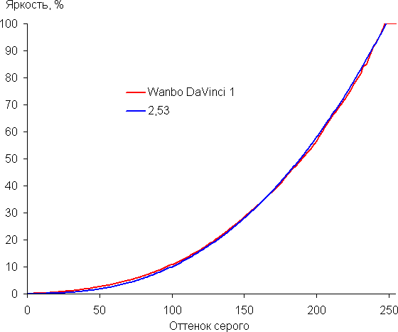 Аппроксимация полученной гамма-кривой (кроме участка в светах) дала значение показателя 2,53, что выше стандартного значения 2,2. Реальная гамма-кривая немного отклоняется от аппроксимирующей функции. В целом изображение воспринимается как слегка затемненным: