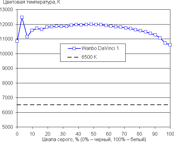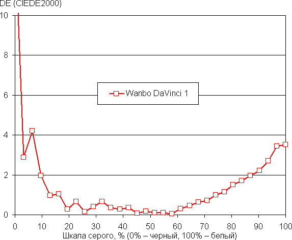 Близкий к черному диапазон можно не учитывать, так как в нем цветопередача не так важна, а погрешность измерения цветовых характеристик высокая. Цветовой баланс средний, так как цветовая температура значительно выше стандартных 6500 К. Но хотя бы ΔE ниже 10 единиц, при этом оба параметра не сильно изменяется от оттенка к оттенку на значимой части шкалы серого, что положительно сказывается на визуальной оценке цветового баланса.