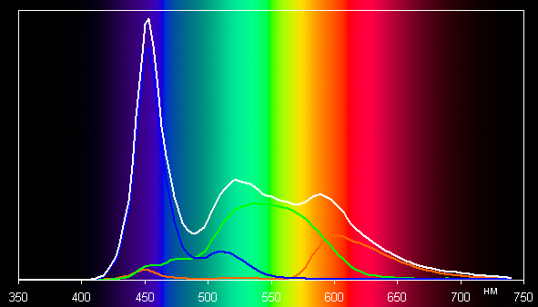 Поэтому цвета выглядят бледноватыми. Ниже приведен спектр для белого поля (белая линия), наложенный на спектры красного, зеленого и синего полей (линии соответствующих цветов):