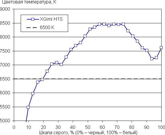 Близкий к черному диапазон можно не учитывать, так как в нем цветопередача не так важна, а погрешность измерения цветовых характеристик высокая. Вариация цветового тона на шкале серого относительно большая, что в общем случае для DLP-проекторов нетипично.