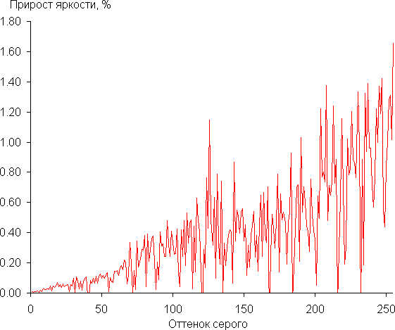 Для оценки характера роста яркости на шкале серого мы измерили яркость 256 оттенков серого (от 0, 0, 0 до 255, 255, 255). График ниже показывает прирост (не абсолютное значение!) яркости между соседними полутонами: