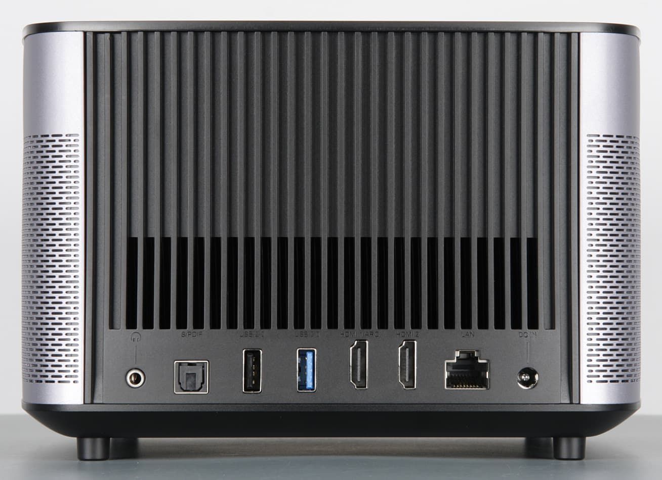 Декоративная решетка алюминиевого кожуха также маскирует вентиляционные решетки, но где именно они расположены мы выяснять не стали. На задней панели также есть вентиляционные решетки, через которые выдувается нагретый воздух, а в нижней части располагаются интерфейсные разъемы и разъем питания.