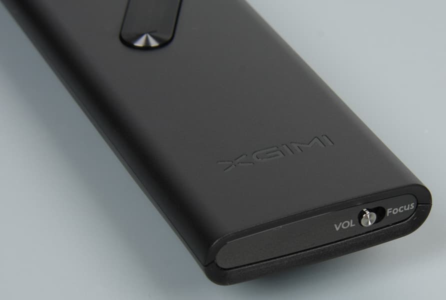 Источниками питания служат два элемента типа ААА. Обозначения ряда кнопок контрастные, на других значки просто выдавлены, но функции этих кнопок понятны, исходя из их расположения и формы. При нажатии кнопки негромко щелкают. Как уже было написано, подключается пульт по Bluetooth. Для спаривания с проектором пульт необходимо близко поднести к проектору и удерживать нажатыми кнопки «Назад» и «Домой». На подключенном пульте постоянно и неярко светится оранжевым значок на кнопке питания. Движковый переключатель на торце пульта меняет функцию кнопки-качалки — изменение громкости или фокусировка.