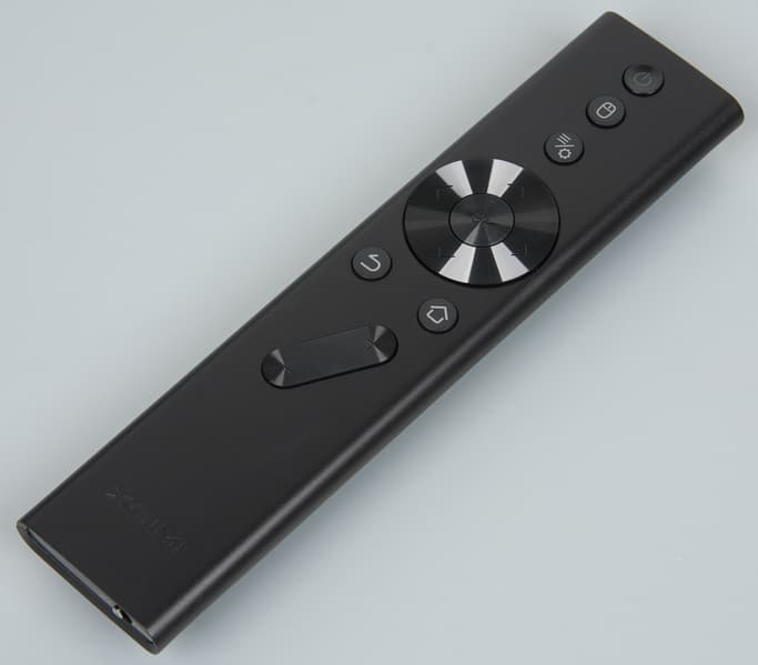 У пульта есть функция координатного ввода — гироскопическая «мышь». Курсор мыши появляется на экране при нажатии на кнопку со схематичным изображением мыши и пропадает после нескольких секунд неподвижности пульта. Также никто не мешает подключить к проектору настоящие клавиатуру и «мышь». Поддерживается прокрутка колесиком. Нажатие на правую кнопку «мыши» соответствует отмене действия или возврату назад. Задержка перемещения курсора «мыши» относительно движения самой «мышью» большая. Смена раскладки физической клавиатуры поддерживается при помощи сторонних приложений (например, Free Physical Keyboard). Поддерживаются некоторые быстрые клавиши из основного и дополнительного мультимедийного набора (например, возврат/отмена, вызов контекстных настроек, регулировка громкости, выключение звука, пауза/воспроизведение, следующий/предыдущий трек/файл, запись снимков с экрана, переключение между приложениями, переход на главную страницу интерфейса и т. д.). Нужно отметить, что в целом штатный интерфейс самого проектора хорошо оптимизирован для использования только курсорных кнопок комплектного пульта ДУ.