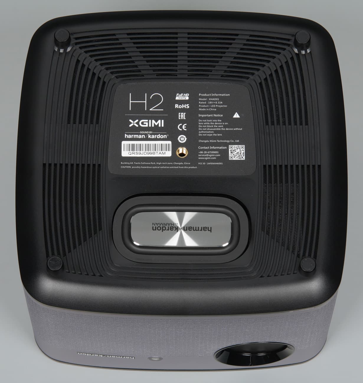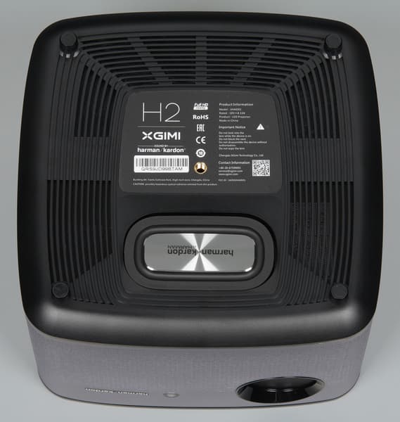 Снизу есть ничем не защищенный пассивный излучатель, улучшающий воспроизведение басов, вентиляционные решетки, четыре ножки с круглыми резиновыми подошвами и металлическое штативное гнездо, которое можно использовать при установке проектора на штативе, на напольной или на потолочной стойке.