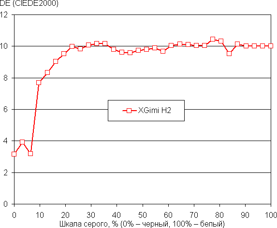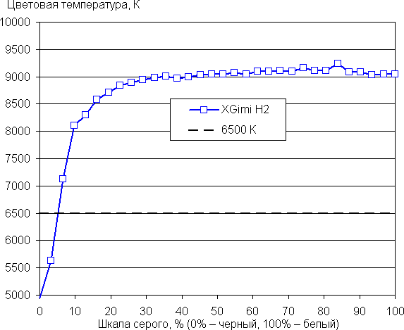 По умолчанию и в нормальном режиме цветовая температура высокая (но не чрезмерно) и отклонение от спектра абсолютно около 10 единиц, что тоже не мало, однако оба параметра несильно изменяются на значимой части шкалы серого, что улучшает визуальное восприятие цветового баланса. В итоге особого смысла корректировать цветовой баланс нет, уж лучше пусть будет яркость и контраст побольше: