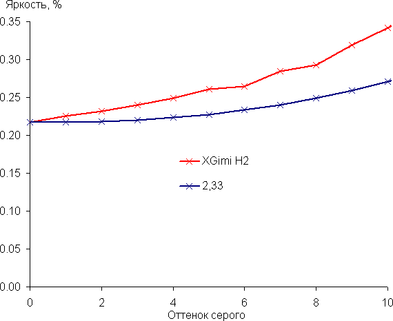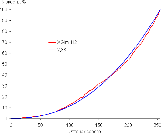 Аппроксимация полученной по 256 точкам гамма-кривой дала значение показателя 2,33, что немного выше стандартного значения 2,2, при этом реальная гамма-кривая заметно отклоняется от аппроксимирующей функции:
