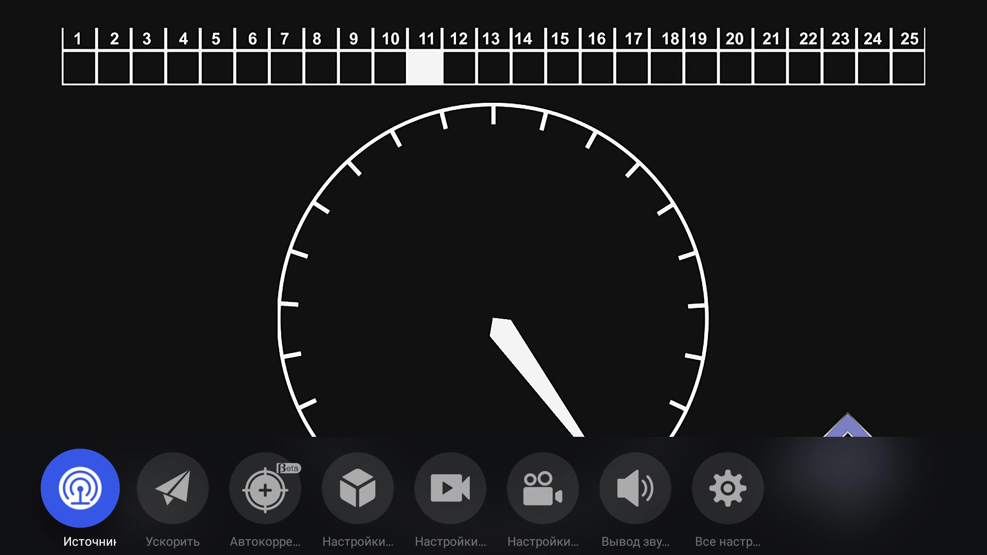На виртуальном пульте ДУ отметим кнопку в верхнем правом углу в виде наклоненной стрелки. Этой кнопкой вызывается контекстное меню (круглые значки в нижней части экрана) с полезными настройками, в том числе с настройками изображения.