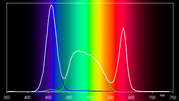Ниже приведены спектры для белого поля (белая линия), наложенные на спектры красного, зеленого и синего полей (линии соответствующих цветов):
