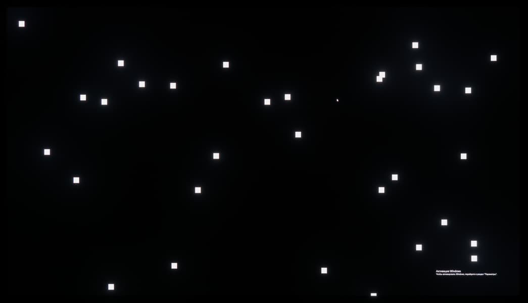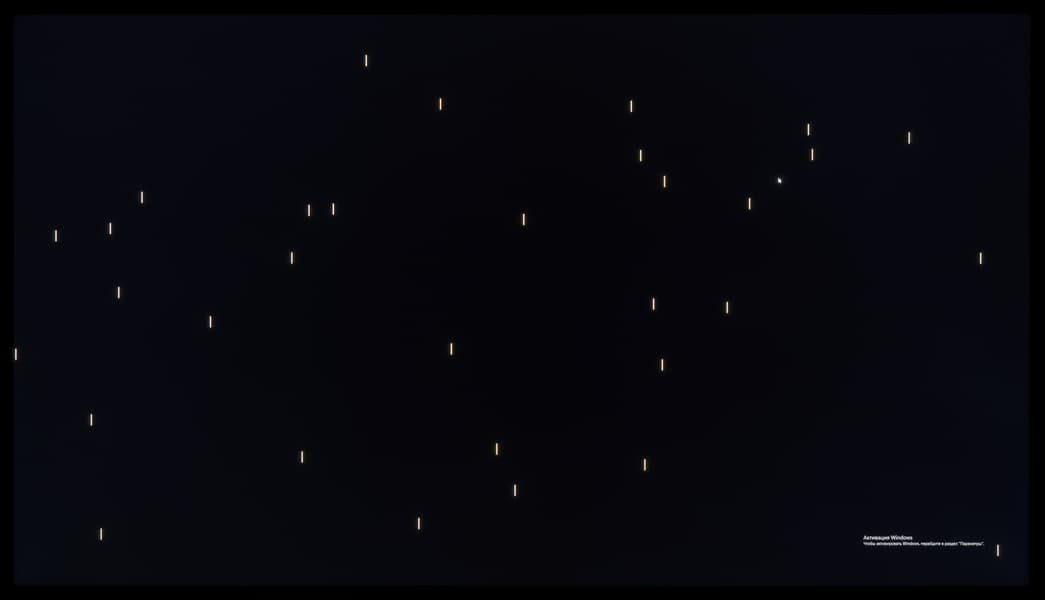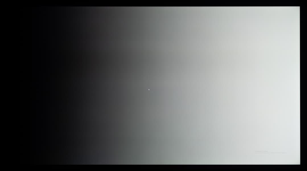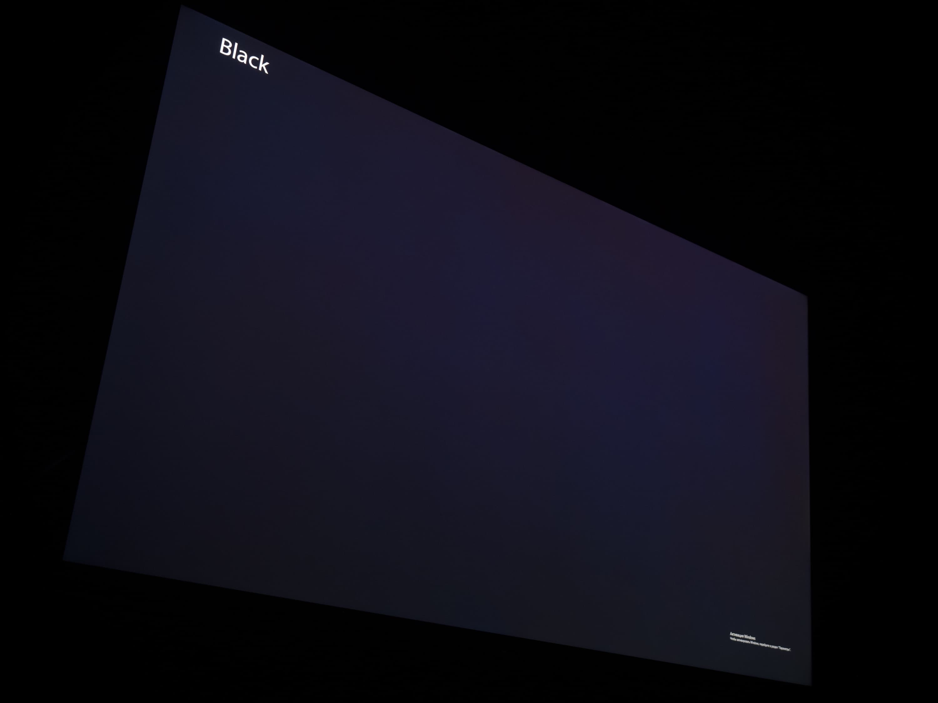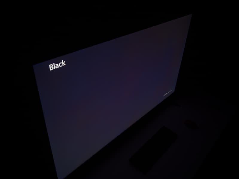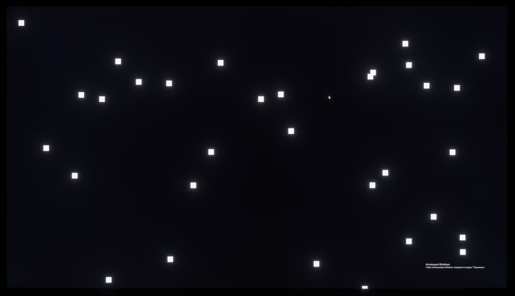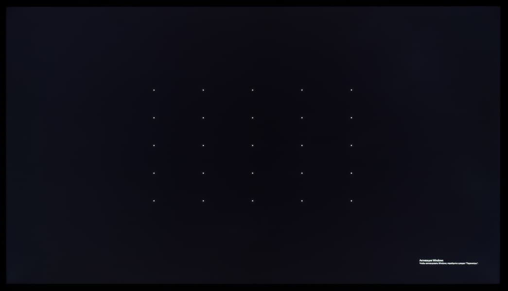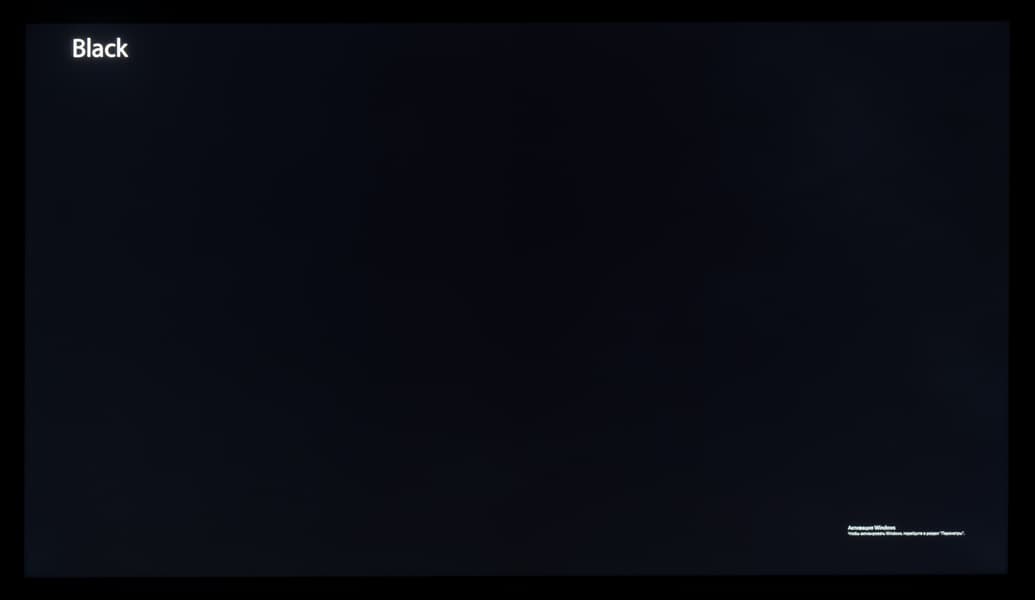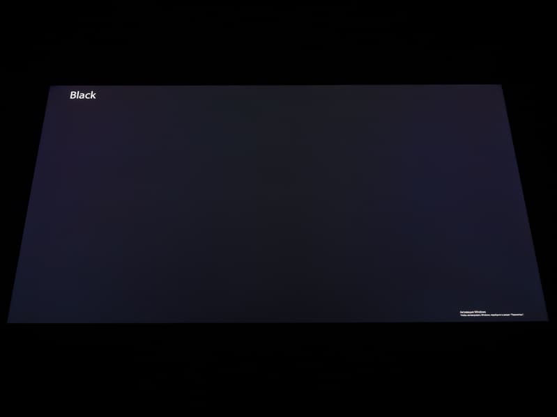 А вот при выводе черного поля равномерность подсветки оказалась очень хорошей, без визуально выраженных дефектов однородности по полю матрицы, что подтверждает фотография, сделанная с расстояния до экрана в 3 метра.